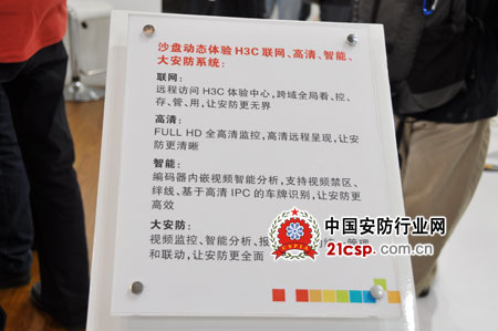 作为安防行业重要厂商之一,H3C在此次安博会上充分展现出了“领袖”风采。H3C展位位于展区醒目位置,分为IMOS联网基础业务体验区、IMOS inside行业联网增值方案体验区、产品质量体验区等六大展区,这也是H3C参加历届安博会展示面积和规模最大的一次。在展览中H3C首次结合沙盘模型互动展示H3C联网、高清、智能、大安防解决方案,以“海量、开放、统一、融合”四大专题诠释IMOS大联网业务体验,并首次深度解剖展示H3C监控产品高品质。