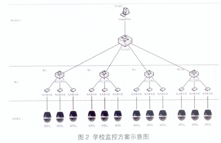 案例一 西安某学校监控方案主要在教室和楼道、办公室等场所实施监控布线方便,侧重于室内 要求成本低廉,适于校园网络环境的传输,在画质和流畅性上能够满足监控的需求。综合以上因素考虑,采用视频服务器为主的监控模式。例如图2示:楼层间各采用交换机来连接视频服务器,通过校园网络来传输,分辨率向下可调,半球型摄像机与防暴球罩配合镶于天花板中,符合校园气氛,自然和谐。 案例二