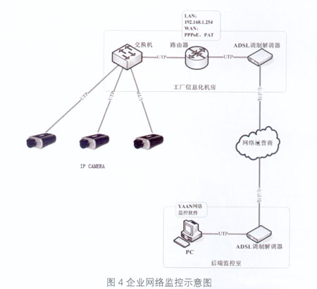 天津某企业网络监控方案,其企业办公和工厂异地,在办公场所远距离监控工厂主干道和进出口通道情况。要求网络消耗小,图像效果和流畅性满足视频监控的需求,通过ADSL网络连接,要求摄像机支持DNS动态域名,压缩编码效率要高性价比高。综合以上因素考虑,采用网络摄像机,如图4所示。 从工程施工操作角度来说,网络监控相对于模拟监控来说,已经拥有得天独厚的资源优势,综合布线简单,扩展灵便,集成度高,后端数字监控及录像快捷方便等等。 网络视频服务器匹配灵活,网络摄像机小巧灵便,网络球机性能卓越,采用哪种模式要根据客户实< | |