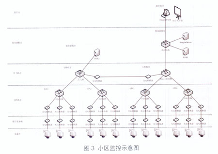 东北某家属小区监控方案,要求将小区各条主于道、楼角等地方实施监控,要求日夜录像,具备隐私遮挡、移动侦测、报警联动功能、工作稳定,美观大方。小区已经铺设专用监控网络,各小区之间采用光纤互联,汇聚到监控主机房室,要求图像清晰,速度快捷,工作稳定,适宜严寒工作环境等特点。综合考虑该小区应该采用网络监控,采用网络球机为主的监控器材,如图3所示。 前端采用网络球机,通过小区专网连接到各小区交换机,再由光纤将小区间连接。配置主机服务器全面负责监控设置,配置转发服务器实时为客户端转发音视频图像,配置专用录像服务器,实时监控联动录像。 案例三