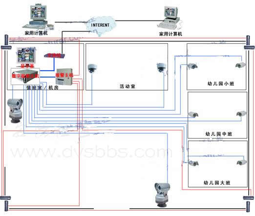 | | |  | | 幼儿园网络视频监控系统方案 | [来源] [作者] 本站编辑 [发表时间] 2008-6-28 13:36:00 | | 一、幼儿园视频监控系统概述 今年以来,全国各地幼儿园、学校校园内连续发生多起伤害儿童、青少年的恶性案件。为了保护青少年及幼儿的安全,运用现代的科学技术加强对中小学、幼儿园等场所的安全防范工作。在幼儿园安装一套视频监控系统,将对幼儿园和校园实施24小时的监控,家长能够通过幼儿园的宽带网络看到孩子在幼儿园、学校的各种情况。在幼儿园围墙上安装红外对射报警探测器,能够不断的发射红外信号,如果有人闯入即可报警。 二、幼儿园视频监控系统设计原则 本视频监控系统是专门为幼儿园的安全防范设计的。针对幼儿园的具体情况,结合现代化的视频监控报警技术,为幼儿园视频监控报警系统提供一套安全可*、运行稳定的智能网络视频监控系统。 先进性: 充分考虑电子信息技术的突飞猛进发展趋势,采用国内外成熟的技术,起点要高,在技术上具有一定的超前性,保证智能网络监控系统建成为先进的网络化,智能化程度高;防范严密的综合安全防范系统; 实用性: 以实用为主,在工程设计和实现的过程中,始终要把使用单位的实际需求放在首位,做到灵活、好用。充分分析视频监控系统的需求及学校环境情况,采用优质设备,满足安防要求,保证操作方便耐久实用; 扩展性: 系统可集中管理、监控,分散控制,总体结构具有较强兼容性和可扩展性,既便于系统的充实、完善、改进和提高,又便于设备的更新、换代; 经济性: 系统优化设计,子系统具有标准化、模块化 ,在实现先进性和保证可*性的前提下,达到较优的性能价格比。 三、幼儿园视频监控系统设计方案 幼儿园视频监控系统是专门针对幼儿园实际需求中的具体情况而开发的监控管理系统,特别是远程监控管理。本视频监控系统采用视频采集压缩和处理技术,结合先进的计算机网络及通讯技术,将模拟视频信号数字化并压缩编码,在可利用的数字通讯线路上进行传输。针对幼儿园视频监控的特点和需求,为保证幼儿园15个监控点都能远程实时监控,我们在幼儿园的每个教室安装2台摄像机,保证每个班都没有死角;在活动室、幼儿园的两个大门口及小操场各安装2台台云台的摄像机。为了能够使家长在家也能看见孩子们的活动情况,选用一条10m 带宽的宽带,家长通过专用的视频监控软件,输入正确的用户名和密码,就能监控自己孩子在幼儿园的情况,这样即可以保证所有监控点都能被实时监控,又解决了访问权限的问题。 四、幼儿园视频监控系统构成示意图: