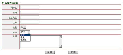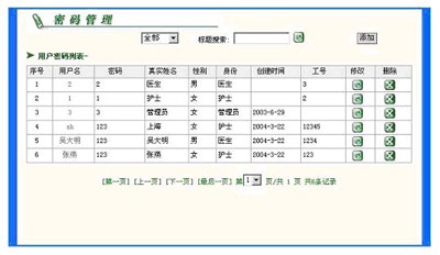 1. 系统管理员可以向系统添加护士、医生、管理员,修改他们的信息,或者删除记录。操作界面如下: