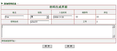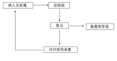 2). 医务人员通过密码生成器自动生成密码,并打印出该病人的姓名、性别、入住时间、病房号、床位号及密码等信息的单据交于病人或其家属,同时要求在领取密码登记表上签名。