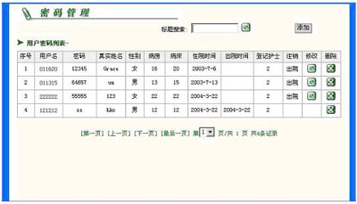 病人出院时,护士点击该病人的“出院”按钮,注销该病人,同时改病人的密码无效。