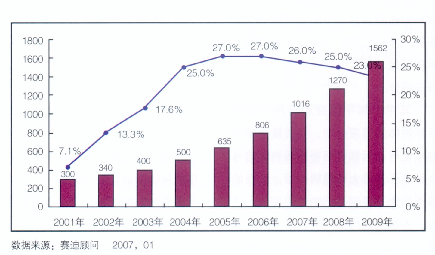伴随着中国城市化的进程,国家提出建设“和谐社会,平安城市”思路,全社会迫切雳要利用先进的安防技术,对突发事件和安全隐患进行预防。随着2008年“奥运会”、2010年“世博会”等重要国际活动在华举办,将推动视频监控产业持续保持20%以上的高增长速度,预计2008年行业产值高达 1600亿元(如图 1)。
