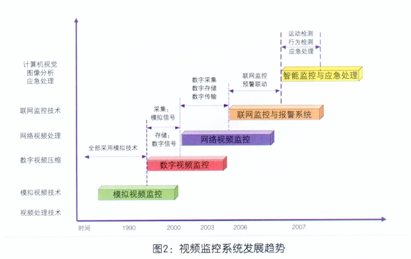 目前,信息技术的发展正处于一个激烈变革的时代,个人化、数字化、移动化趋势变得更加明显。这次技术革命的特点表现为:新技术带来的转型是整体性的,几乎覆盖了整个多媒体通信领域,为多级视频联网监控提供了全新的技术基础。城市视频监控发展在经历了模拟时代、数字时代、远程时代后,正大步跨入城城、广域互连的崭新阶段。监控行业的数字化进程正方兴未艾.网络化进程刚刚起步、智能化进程已呼之欲出,这背后信息技术扮演着重要的魔术推手作用(如图2)。