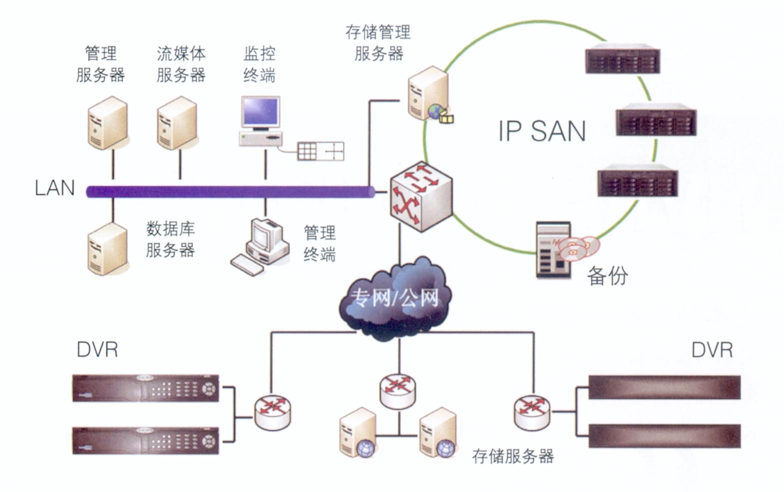 dvr、存储服务十 nas或ip san以及nvr构成异构的分布式存储系统,可应用于大中型监控系统的前端或分控中心,监控中心由2个网络构成,一个是存储区域网络,一个是信息管理网络。 存储区域网络对系统中所有存储的录像资料进行统一调度,满足系统中用户的点插或下载要求,也可以对重要的监控事件进行冗余录像(也就是热备),如重大预案的实施过程录像、重点防护区域的报警录像等等,也可以对一些需要长期保存的重要录像资料进行备份、迁移(也就是冷备)。在存储设备的配置上,可以根据规模或实际需要进行选型。 信息管理网络可以根据具体需要配置相应的服务器或终端访问设备,如用于管理设备及用户管理服务器,用于记录设备信息、用户信息的数据库服务器、提供音视频流转发的流媒体服务器、用于配置和管理设备、用户信息的管理终端、用于监控操作的监控终端等等。 这样的监控方案,融合了目前监控领域的主流技术,结构合理、简单,具有较强的可扩展性、兼容性。符合监控业务的实际特点,能很好地满足监控业务需求。 结语 dvr、 nvr、 nas/ip san/san提供了不同的存储平台,主要是针对不同的监控系统架构、不同的监控应用要求,对于数码监控来说,不同存储平台提供的存储介质是相同的,即硬盘,所以本质上是一样的。存储市场今后的发展趋势主要看前端(摄像机、快球)的网络化(ip)进程,随着ip前端产品的市场需求扩大,nvr也将会占有更多的市场份额,所以,目前dvr与nvr还是呈现互补的市场态势。 总之,市场需求与技术发展将共同推动安防网络存储的不断发展,今后的安防网络存储呈现怎样的市场格局,让我们拭目以待。 | |