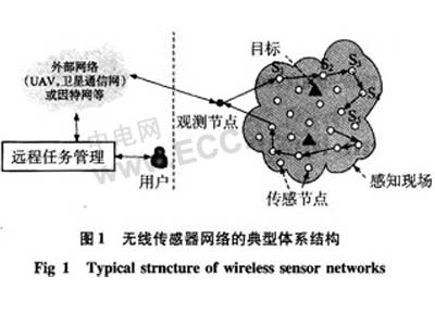 无线传感器网络是一组传感器以AdHoc方式组成的有线或者无线网络,其目的是协作地感知、采集和处理传感器网络所覆盖的地理区域中感知对象的信息,并传递给观察者。这种传感器网络集中了传感器技术、嵌入式计算机技术和无线通信技术,能协作地感知、监测和采集各种环境下所感知对象的信息,通过对这些信息的协作式信息处理,获得感知对象的准确信息,然后,通过AdHoc方式传送到需要这些信息的用户。用于传感器网络的传感器与一般概念的传感器不同,它除了能够感测被测物理量的变化并输出相应的变化信息外,还要具备远程通信功能,必须是一种智能型的传感器。另外,要完成通信功能,除具有敏感元件外,还必须具有电源、嵌入式微处理器、存储器、数据传输通信部件等。图1是典型的传感器网络结构图,它包括传感节点(sensor),观测节点(sink)和基站等。