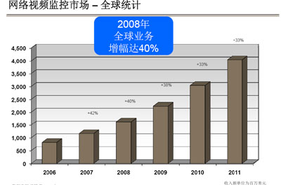 以上资料显示,2008年网络视频监控市场全球业务涨幅将在40%,2008年全球网络前端产品——摄像机市场份额仅占23%,而中国市场仅占其中的8%,说明中国网络视频监控市场<