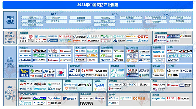 为全面、直观地呈现安防行业的产业结构与产业链上下游关系,协助行业参与者系统把握产业整体布局与发展脉络,为企业战略规划与资源整合提供参考,推动产业链协同创新与高质量发展,中国安全防范产品行业协会依托中国安防大数据服务平台,在深入分析会员单位及部分上市企业经营状况的基础上,结合对大量历史资料和行业动态的系统研判,精心编制了《2024年安防行业产业图谱》(见下图)。该图谱全面、细致地展现了安防行业上、中、下游产业体系的整体架构,并列出各环节代表性企业,清晰勾勒出产业生态的全景视图。