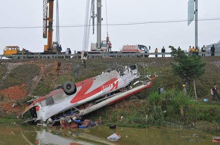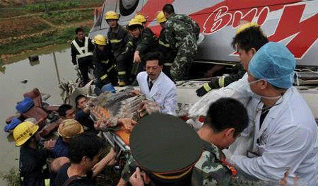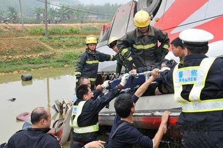 记者在现场看到,白色的大客车底部朝天仰卧在路基下,头部已经落入下面的鱼塘。救援人员用切割工具将客车割开,将伤者从客车中抬出来,送进在一旁等待的救护车。四周有不少村民围观。客车里面的人员全部救出后,被大型吊车吊起运走。
