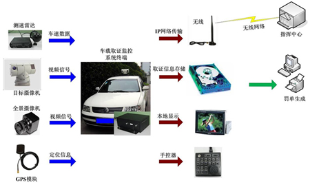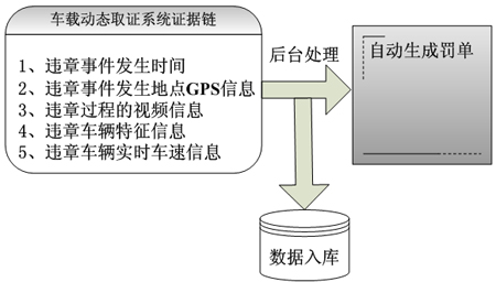 从现在来看,解决类似上述公路现场执法取证难的有效方案就是采用车载动态取证系统。该系统是指采用先进的数字视频处理技术,在警车或其他执法车辆上安装车载终端,对执法过程中的视音频信息、图片信息、雷达测速信息、GPS卫星定位信息等,进行采集保存处理;判定车辆是否违章驾驶;通过分析车辆特征信息辨认车辆是否存在未经处理的违章记录;系统还可通过无线网络将现场信息上传至指挥中心,后台软件可对违章数据进行检索、编辑、入库、生产罚单等后续处理工作。