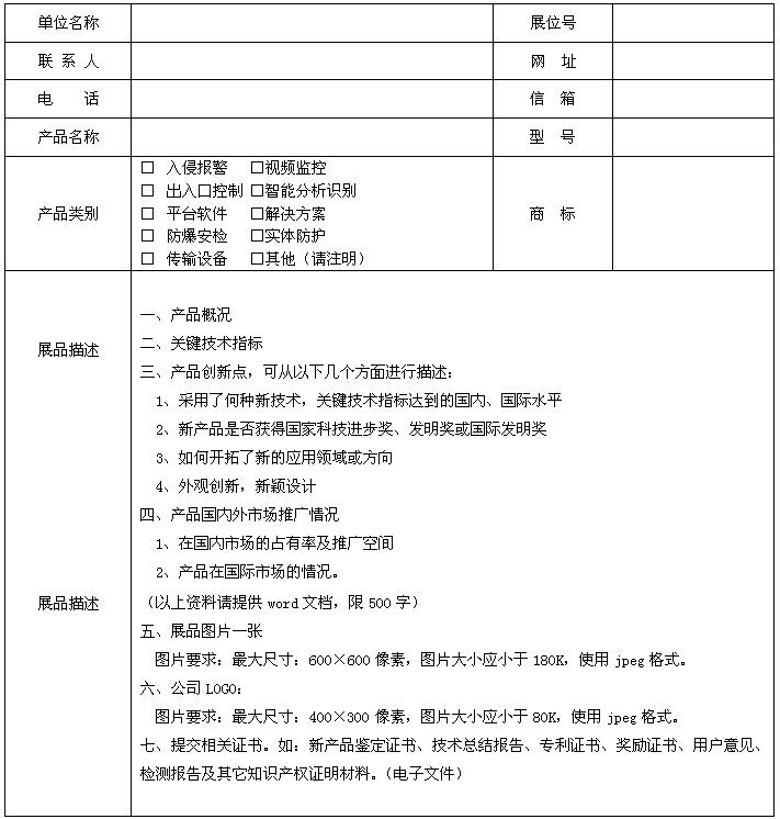 2014年中国国际社会公共安全产品博览会创新产品申报表(样本)