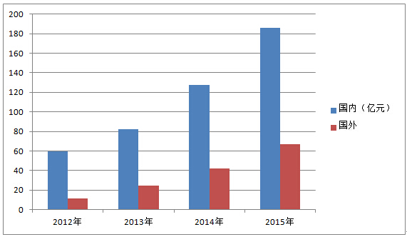2015年海康威视国内市场收入实现186.15亿元,同比增长43.16%,海外市场收入实现66.56亿元,同比增长57.36%。