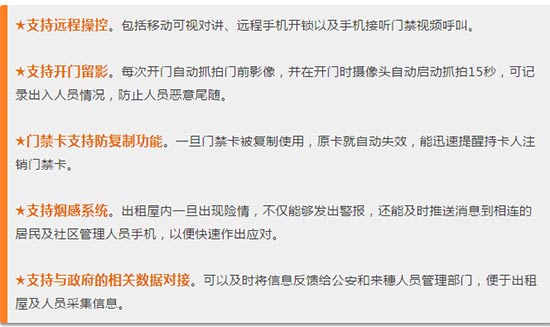 出租屋智能门禁安装在规模以上出租屋出入口处,门禁终端与屋主、租赁人的手机通过智能门禁APP实时链接,可以实现五大功能——