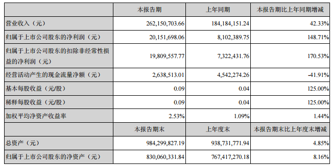 2017年上半年度,汉王科技实现营业总收入为2.62亿元,同比增长42.33%;营业利润1801.06万元,同比增长459.09%;利润总额为2304.73万元,同比增长139.98%;归属于上市公司股东的净利润为2015.17万元,同比增长148.71%;基本每股收益为0.09元,同比增长125%。