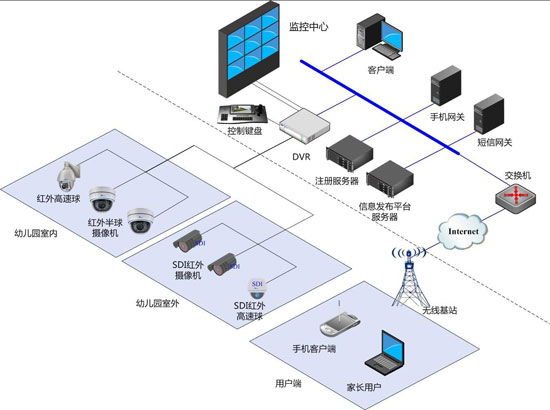 系统设计在幼儿园的门口、过道、教室、活动区及其它重要位置的实时监控,确保幼儿园的安全管理和安全保护的效率,预防意外伤害事件的发生。对重要活动区域的实时视频流分享,让家长能通过3G网络随时了解自己的小孩在集体活动当中的参与度和把握小孩的性格,并且还能对幼师在学习和生活方面对小孩的方法方式以及态度进行监督。