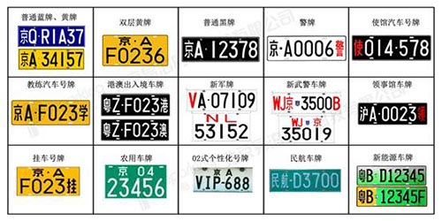 蓝牌、黄牌、挂车号牌、新军牌、警牌、新武警车牌、教练车牌、大使馆车牌、农用车牌、个性化车牌、港澳出入境车牌、澳台车牌、民航车牌、领馆车牌、新能源车牌等。