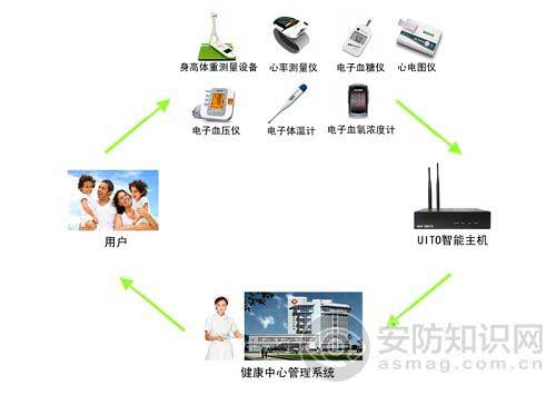 在家里使用电子化测量仪器,测量体温,脉搏、血压,血糖,血氧浓度,心电图,身高,体重等数据,然后通过智能家居系统传输到合作医院数据中心长期保存,系统可以对用户的数据做出基本的分析和建议,合作医院的医生对用户的健康状况进行实时了解及长期跟踪,通过对数据的分析及时发现用户的健康隐患,为用户提供医疗健康咨询服务及健康指导。