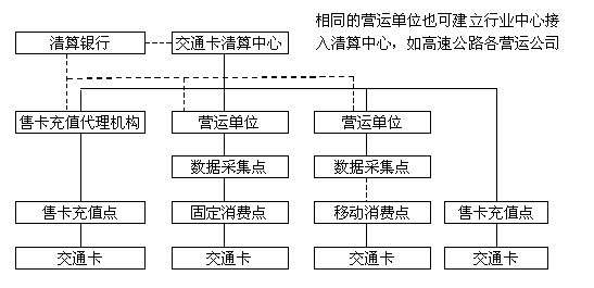 第二层由营运单位和售卡充值代理机构组成。公交公司、地铁、出租车公司、自来水公司、煤气公司、商场等都是一卡通系统的营运单位,对持卡人而言,他们是持卡人的业主,公共交通一卡通系统为这些业主提供服务。各营运单位的消费点装有消费终端(如车载机、出租车IC卡计价器、IC卡水表、IC卡气表、商场POS机等),持卡人用IC卡消费后,交易数据经营运单位上传到清算,清算中心根据营运单位的消费记录进行清分结算,及时将各营运单位的营业收入划到其帐户上。售卡充资代理机构为一卡通系统提供售卡充值点的经营单位,该单位可以是银行,也可以是公交公司、地铁、出租车公司等营运单位。售卡充值代理机构汇总售卡充资点的营业资金上交到清算银行并将售卡充资点上送的售卡、充值数据转发到清算中心,清算中心日终清算后通过清算银行进行资金划拨。