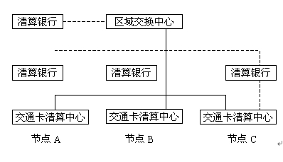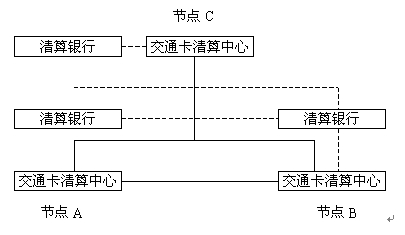 无区域交换中心的对等模式如图四所示,这种模式是两两互联的模式,每个节点的交通卡清算中心的作用都是相同的。每个节点在处理交通卡消费交易时,首先根据城市代码区分交通卡的发卡方,如果发卡方属于本城市,则在本城市处理,如果发卡方不属于本城市,则将该类交易按城市代码分类并另行存放,当所有交易处理完成后,然后根据城市代码将异地交通卡消费交易批量发送到对应的发卡方交通卡清算中心,交由发卡方交通卡清算中心处理。节点之间的对帐以发卡方处理结果为准,但受理方可以在第二天对可疑帐务提出调整,对帐结束后,每个节点对应收应付款进行轧差,由付款方通知结算银行划帐。