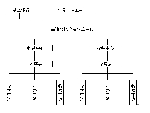 交通卡清算中心与高速公路联网收费系统的连接如图二所示,高速公路联网收费系统由收费车道、收费站、各营运公司收费中心以及高速公路收费结算中心组成。收费结算中心的主要职责是执行通行费的清分、与交通卡清算中心对帐、组织联网收费系统正常运行等;营运公司的收费中心主要负责收集、存储和管理所属收费车道和收费站的各种数据,负责对涉及本营运公司的收费数据进行核查、统计,对收费站进行监督管理以及对通行卷的调配管理;收费站对所属车道进行管理,负责采集所属车道的各种原始数据并与收费结算中心以及收费中心交换数据;收费车道处理联网收费系统网络结构的最低层,负责各种收费的直接操作及特殊情况的处理,原始数据由收费车道产生并上送到收费站。