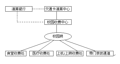 交通卡在校园收费系统中的交易数据由校园收费中心汇总后传送到交通卡清算中心,交通卡清算中心日终处理时对校园收费中心的资金进行清算,清算结束后通知清算银行将应付款划拨到校园收费中心的开户银行。