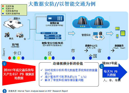 以智能交通为例,无论抓拍的是抽象图像还是视频,里面有大量的元素是重复、没有意义的,抽取出有价值的元素、传输到后台,可以大大减少带宽压力、网络以及后台的开销。据IHS预测,到2017年底,交通系统每天产生457PB视频原始数据。如果我们通过实时视频分析进行数据抽取,数据量可以降低6成,还能解决带宽和后端存储容量问题。更重要的是,除车牌外,这些元素还包括个人的特征,可为之后的智能分析提供元素,甚至一些数据的向量。