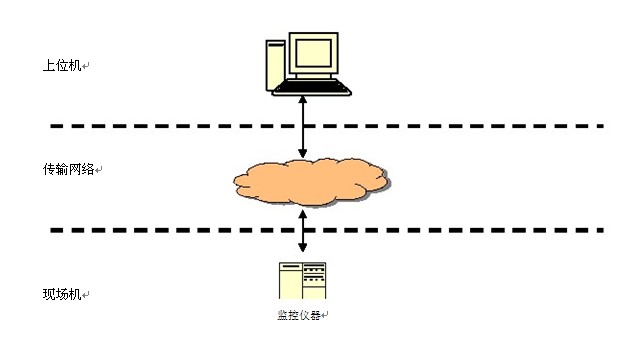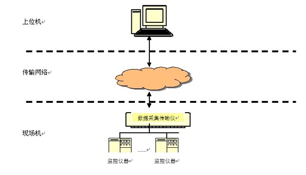 (2)现场有一套或多套监控仪器、仪表,监控仪器、仪表具有模拟或数字输出接口,连接到独立的数据采集传输仪,上位机通过数据采集传输仪实现数据交换和收发指令。