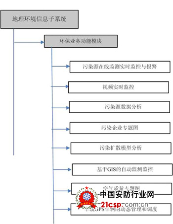 本系统内的环境地理信息子系统不仅要实现GIS的基本功能,更要服务于环保行业的具体业务,如污染源区域划分、烟气设备管理、污染源数据显示等,可以说环境地理信息子系统是环保业务的集中体现,其功能框图如下: