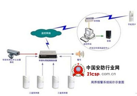 在排污口监控点周围的重要监控地点安装三鉴探测器、红外一体机,首先将三鉴探测器和红外一体机接入到环保专用视频服务器,当有警情发生时,可以直接通过环保专用视频服务器直接输出到警号,能起到阻止作用,防止警情进一步发展,同时报警信号通过专用网络上传到各级监控中心,在监控中心,通过环保远程综合监控系统软件可以对前端报警信号处理、报警联动视频等进行设置,并可以设置个性化的报警声音,通过音箱或其他音频输出设备,提醒工作人员前方有异常状况发生,可以及时作出相应的处理。如果监控中心值班人员不在的情况下,系统还会通过短信猫将警情发到相关人员的手机上,让其可以及时地了解现场状况。如上图所示。