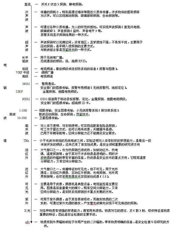 安全防范系统采用最多的探测技术是电磁探测,探测装置(报警器)大多为电子设备。因此、以电磁波谱为基线来建立探测技术谱,来简单地概括安全防范系统所采用探测是是最合适的。下表为探测技术谱: