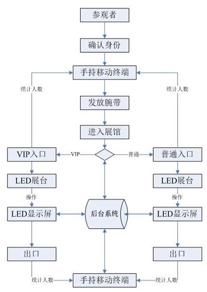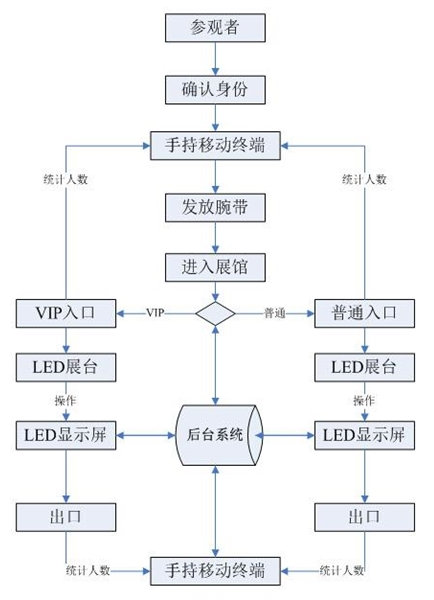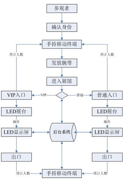 和目前展会流程相似,参观者在进入场馆之前应先填写信息采集卡进行登记(或采用名片交换),以便打印腕带和后续信息采集与统计,可以结合网上注册子系统在参展之前提前登记避免拥堵。