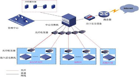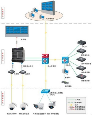 视频图像传输:数字非压缩高清摄像机具备光纤接口,直接通过光纤接入视频综合平台,实现高清视频图像编码、矩阵切换和输出显示,达到图像质量高、传输延时低的效果;IP视频图像通过体育馆视频传输网络接入监控中心核心交换机。