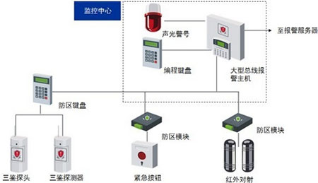 系统采用总线制构架,前端探测器通过总线模块接入报警主机,报警主机通过IP方式接入报警服务器,实现与视频监控系统的联动。系统构架如下图所示: