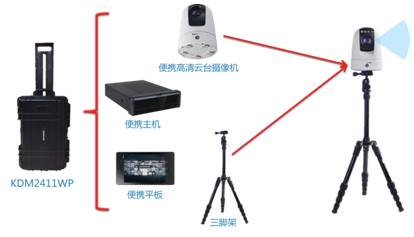 所有关键器件(无线便携高清云台摄像机、无线便携平板电脑、无线便携主机)均合理置放于满足IP66工业标准且带自主供电功能的便携箱内,使用过程中不需要额外架设线缆即可满足八小时以上的正常工作。