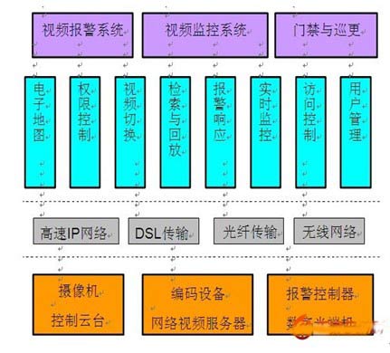 传统的监控系统从物理结构上可以分为图像和报警信号采集、信号传输和中心控制与显示三个部分。平安校园系统从物理结构上也可以按照这种方式分析,但是××学校平安校园系统与传统的中小规模、区域性的监控报警系统有明显的区别。由于该系统的接入容量远远大于传统的监控系统,涉及的控制功能要求更加网络化,同时需要对接其它的系统如报警系统、门禁系统、巡更系统等等。因此在系统层次结构上要更加复杂,涵盖的内容更加丰富。系统结构图如下: