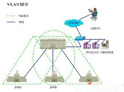 由于现在多数校园网内交换设备提供多种优化功能,前端网络视频设备可根据交换设备的特性,支持如VLAN、QoS等优化管理,达到内部传输高效、安全。如果该区监控点数较多,建议对局域网进行VLAN划分,如图:管理中心的交换机设置在STRUNK工作状态,可以访问多个VLAN,各教学楼分在不同的VLAN中,避免数据交叉,越权访问。