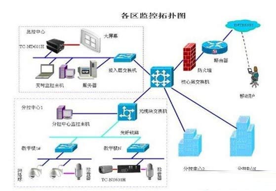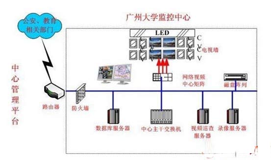 系统是构建光纤网之上的,相对独立的校园内网络监控平台系统,它综合管理本校内的所有监控前端。系统中心一般即为学校的主控室(或信息中心、网管中心等),系统中心可以通过数字解码将数字图像还愿为模拟图像,在电视墙上显示所有的实时图像。