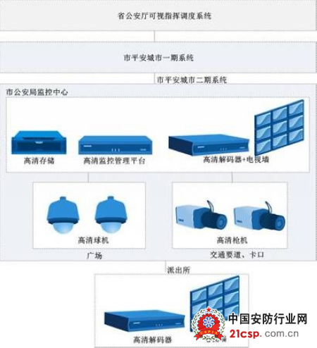在功能方面,系统首先满足了市公安局辖区内5个派出所的高清视频实时浏览需求,即派出所按照各自权限可通过网络访问该系统,并借助高清解码器将前端视频进行解码上电视墙,辅助开展辖区治安监管工作。另一方面,该系统和包涵718个监控点资源的市平安城市一期系统实现了对接,大大扩展了系统的治安监控点范围,促进治安水平的有效提升。