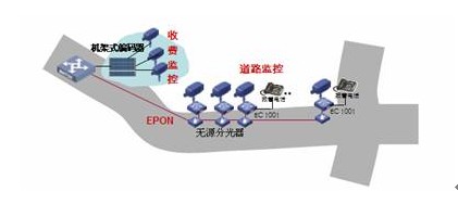 采用EPON组网,路况监控球机接入前端编码器,多个编码器通过一根EPON光纤接入到中心交换机上,布线方便节省光纤资源。编码器内置交换机功能可以接入IP报警电话方便公路报警。还可以将支持IP接口的可变信号板和气象站直接接入编码器交换机端口,实现一网多用,降低整体网络成本。具体见图3。