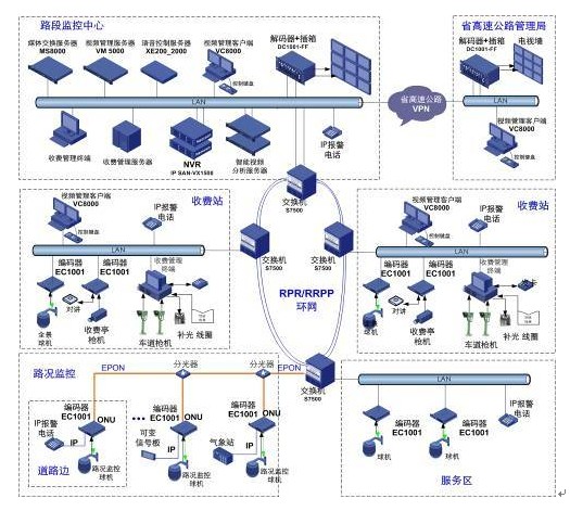 系统基于高性能路由交换机构建公路IP网络传输平台,采用RPR或H3C专利技术的RRPP技术构建IP环网,任何一个节点故障不会导致整个网络瘫痪,RRPP技术可以利用标准的SFP光纤接口而不是PRP专用接口,组网更加方便灵活和低成本。