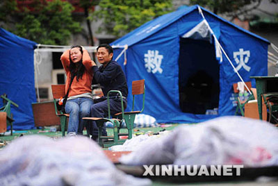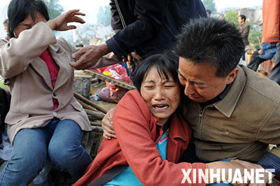 5月15日,木鱼中学学生白妤蔓的父母(右)在女儿的遗体前悲痛万分。在汶川地震中,四川省青川县木鱼中学275名学生死亡,30名学生下落不明。新华社记者陶明摄