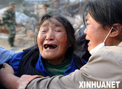 5月15日,在汶川地震中痛失孙子和儿子的老人和媳妇悲痛万分。在汶川地震中,四川省青川县木鱼中学275名学生死亡,30名学生下落不明。新华社记者陶明摄
