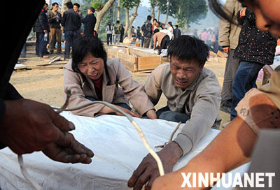 5月15日,木鱼中学学生彭建荣的父母在儿子遗体前悲痛万分。在汶川地震中,四川省青川县木鱼中学275名学生死亡,30名学生下落不明。新华社记者陶明摄