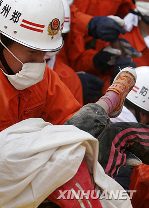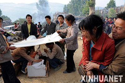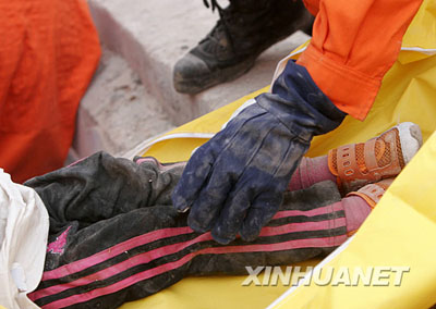 5月15日,河南省消防总队抗震救灾突击队救援人员小心搬运孩子的遗体。河南省消防总队抗震救灾突击队在四川省什邡市红白镇中心小学废墟中紧张搜救幸存者。消防战士小心搬运孩子们的遗体,将搜索出的书包排放好,等待家长认领,以告慰生者。新华社发(张晓理 摄) |