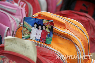 5月15日,在四川省什邡市红白镇中心小学废墟旁,河南省消防总队抗震救灾突击队的搜救人员将找到的孩子们的书包整齐排放,等待家长认领,以告慰生者。五颜六色的小书包仿佛一个个鲜活的幼小生命立于记者的眼前。这是从书包中发现的照片。新华社发(张晓理 摄)