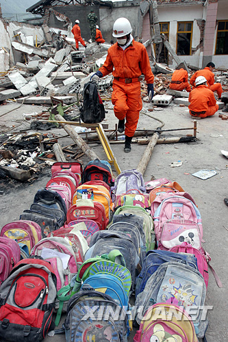 5月15日,在四川省什邡市红白镇中心小学废墟旁,河南省消防总队抗震救灾突击队的搜救人员将找到的孩子们的书包整齐排放,等待家长认领,以告慰生者。五颜六色的小书包仿佛一个个鲜活的幼小生命立于记者的眼前。新华社发(张晓理 摄)