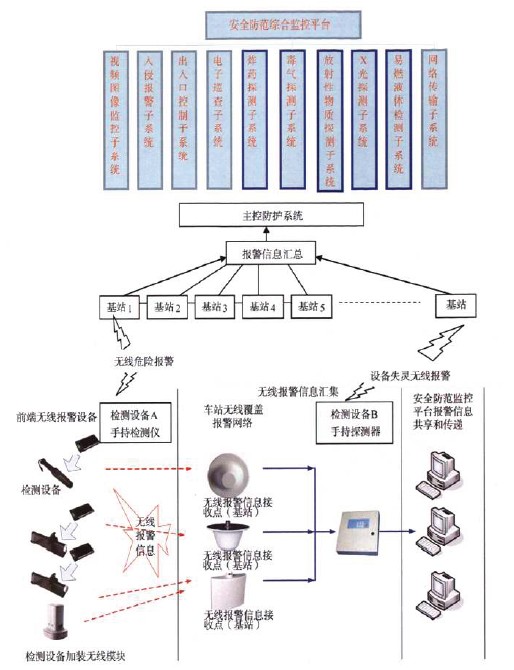 往往需要所有的安防设备能够联合协调工作。而目前在城市轨道交通领域中所使用的大部分移动检测设备是独立工作的,不能实现报警信息的联网化。如果能将移动检测设备及其它临时安装的设备联网,就能将现场的报警信息实时地传送到监控中心,就能够最大限度地保障报警的准确性和实时性,以及安检人员的人身安全。将大量的移动设备联网,还可以更有效地管理这些设备,防止检测设备被盗窃或者遭到破坏;可以实时掌握检测设备的工作状况,保证检测设备处于正常工作状态,进一步减小安全漏洞,提高安防系统的可靠性。
