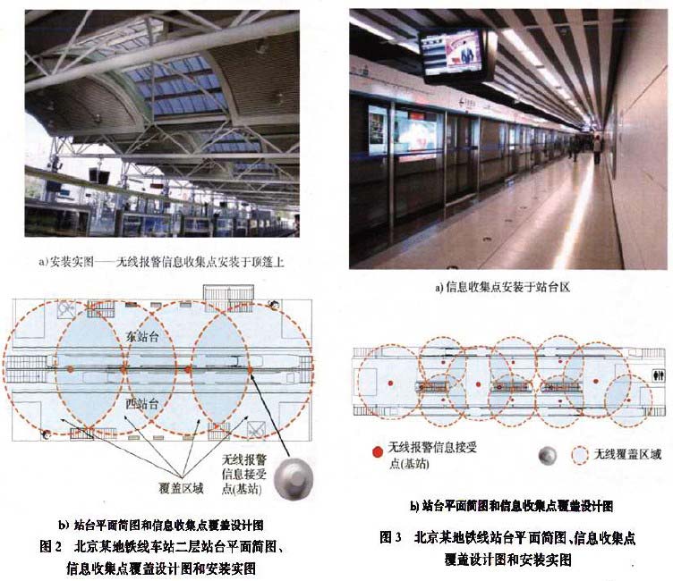 地铁车站基站覆盖设计实践有:图2为北京某地铁线车站二层站台平面简图、信息收集点覆盖设计田和安装实图。图3为北京某地铁线站台平面简图、信息收集点覆盖设计图和安装实图。图4为北京某地铁线车站进站厅平面简图、信息收集点覆盖设计图和安装实图。图5为北京某地铁线车站1层进站厅平面简图、信息收集点覆盖设计图和安装实图。